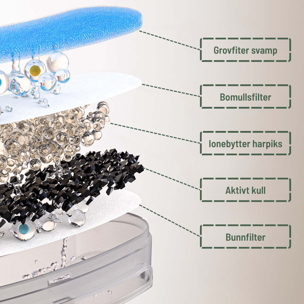 ✅ 5-lags rensesystem fjerner tungmetaller, mykgjør vannet og forebygger urinveisproblemer.