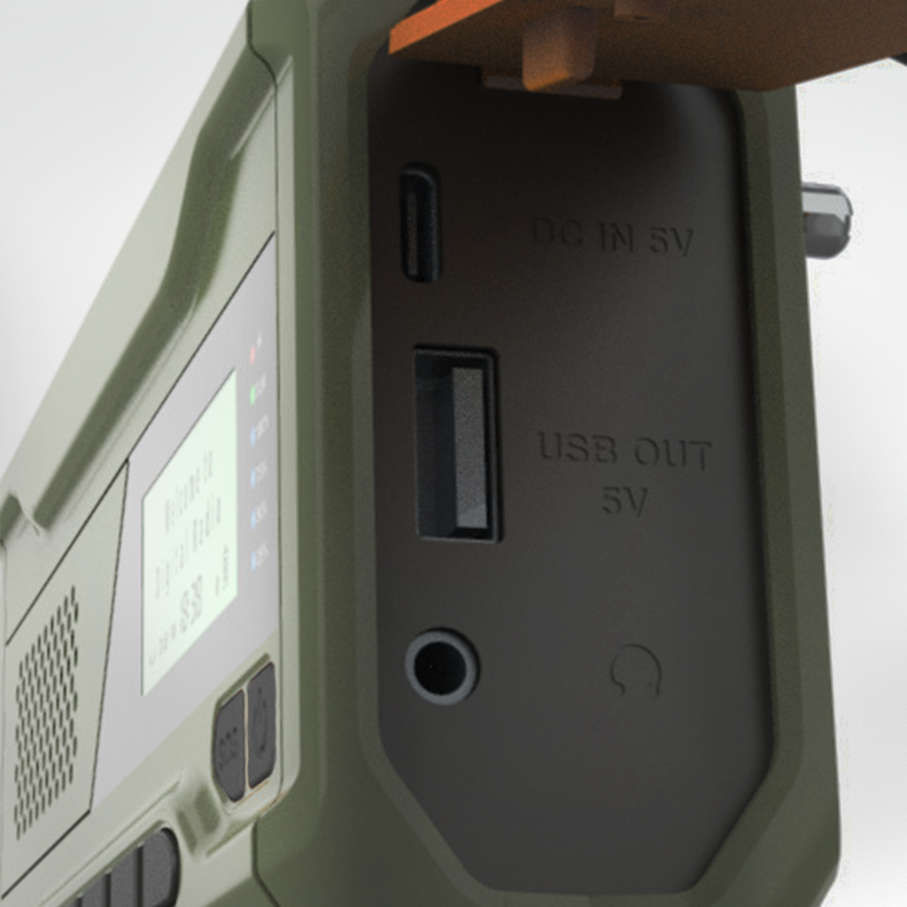 La radioen passivt lade seg opp i sollys, eller bruk håndsveiven for å lade den kjappere.